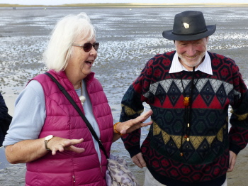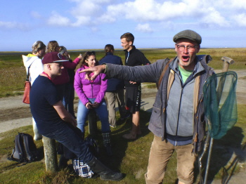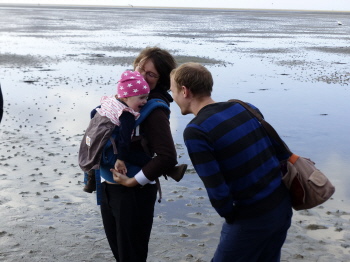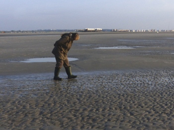 Für Freitagmorgen hatte sich der NDR Hannover angekündigt. Er wollte mit Jutta und mir im Watt über Bernsteinsuche drehen. Nina (Reporterin), Matthias (Film) und Alexander (Ton) erlebten die Nordsee authentisch. Durch einen flachen Priel gingen wir mit Gummistiefeln auf eine kleine Sandbank, imitierten die Bernsteinsuche und antworteten auf die vielfältigen Fragen. Dann stellte ich fest, dass das Wasser näher kam, es war schon Flut. Wir staunten alle, wie schnell das Wasser auflief; wir schafften es gerade noch, ohne nasse Hosen zu bekommen durch den Priel zurück zu waten.