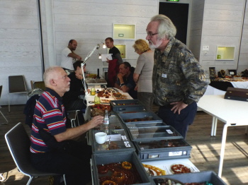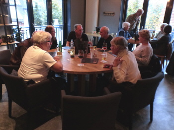Zwischen 13 und 14 Uhr war das Mittagsbuffet für uns geöffnet. Wir konnten in erlesenen Gerichten schwelgen, alles war „vom Feinsten“. Nach dem Mittagessen stellten wir uns zum Gruppenfoto auf, endlich mal wieder, denn 2015 in Rostock und 2016 in Braunschweig hatten wir das nicht geschafft.