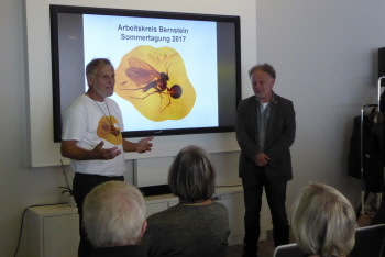 Zum Auftakt des offiziellen Teils der Tagung begrüßte uns Boy auf Platt, erzählte Neuigkeiten vom Bernstein und erklärte uns einiges über die Geschichte des Ortes. Carsten begrüßte dann offiziell alle Mitglieder und Gäste (zusammen waren wir 60 Personen) und verkündete das 25jährige Jubiläum des Arbeitskreises. Er berichtete aus dem Gründungsjahr und den Jahren davor, in denen Wolfgang Weitschat und Peter Christian Voigt die gedankliche Vorbereitung zur Gründung eines Fördervereins für das Museum des GPIH entwickelten.