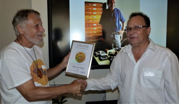 Es gibt im Arbeitskreis Bernstein nur noch ein Mitglied, dass seit 1992 dabei gewesen ist – und das ist Jens von Holt, dem Carsten eine entsprechende Urkunde im Silberrahmen überreichte. Jens erzählte einiges aus dem Jahr 1992; sehr häufig besuchte er Wolfgang im Geomatikum, um Inklusen bestimmen zu lassen.