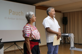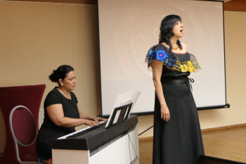 Zu Beginn als Einstimmung auf den ersten Vortrag gab es eine Gesangsdarbietung. Margarita Barajas von der mexikanischen Kulturstiftung in Frankfurt erfreute uns mit drei spanischen Liedern unter Klavierbegleitung von Anel Cruz Ramos, Kulturattaché beim mexikanischen Konsulat.