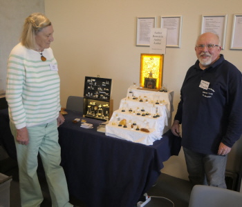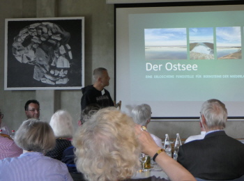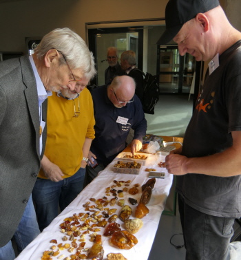 Teilweise in Fahrgemeinschaften begaben wir uns anschließend um 9:30 Uhr in den ca. 2 Kilometer entfernten Steinzeitpark Dithmarschen, unserem Tagungsort. Dort im Museum war ein gemütlicher Raum für uns gemietet. Diejenigen unter den Mitgliedern, die einen Tisch reserviert hatten, begannen eilig diesen zu bestücken. Es gab allerhand zu bestaunen, zu erwerben und zu tauschen: Rohbernsteine in allen erdenklichen Varianten und Größen, Schmuck, Kunsthandwerk, Bücher und Inklusen. Sowohl Bernsteine als auch Geldscheine wechselten die Besitzer. Mein Hauptinteresse galt dem Stand von Jonas Damzen (Inklusenhändler aus Litauen), der zahlreiche Stücke feilbot. Gegen 10:00 Uhr startete mit der Mitgliederversammlung der offizielle Teil der Tagung. Christel Hoffeins und Carsten Gröhn berichteten von den Aktivitäten des Vereins im vergangenen Jahr und Alexander von dem Busche über den Stand der Finanzen. Der Bericht der Kassenprüfer und die anschließende Entlastung des Vorstandes rundeten das Ganze ab.