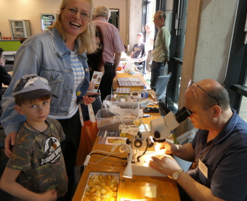 Die Zeit nach dem Abendessen nutzte ich, um weitere Mitglieder kennen zu lernen, über Dies und Das zu fachsimpeln, Geschichten auszutauschen und den (mehr oder weniger – liebe Grüße an „Kaktus-Alexander“) fachkundigen Rat zu einigen meiner Steine einzuholen. Zu diesem Zweck hatte ich mein Mikroskop mitgenommen. Und wenngleich das alte Zeiss-Hufeisen aus den 1930er Jahren für einige gewöhnungsbedürftig war, tat es doch seinen Dienst.