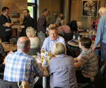 Nach einer herzlichen Begrüßung und nachdem ich mein Fahrzeug neben dem seinen geparkt hatte, begaben wir uns ins Casino. Dessen Charme war zwar etwas rustikal, tat der Gemütlichkeit aber keinen Abbruch. An den Tischen saßen bereits einige andere Mitglieder, von denen mir die wenigsten vertraut waren. Für die Organisation zeichnete unsere Schriftführerin Christel Hoffeins verantwortlich. Nach Begleichung des Tagungsbeitrages erhielt jeder Teilnehmer ein Namensschild ausgehändigt. Einmal am Tisch Platz genommen, begann sofort der lebhafte Austausch und für Speis und Trank war auch gesorgt..